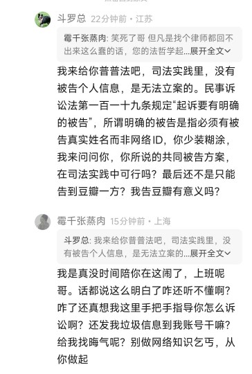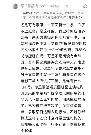 这个影片已经不能用闹心来形容了,影片本身内容差到极致,这一点我在之前的影评里已经详细说明了,这个片子的部分粉丝也是极度不可理喻,评论一句质疑就被用恶言辱骂,辱骂完了之后我被迫反击,他反而成受害者了,真是高,高啊!被骂的人成了加害者,骂人者成了受害者,这本来这影片就是0.5分的影片,现在好感完全败光,0.5分可以四舍五入成0分了!一个自称历史专业的人写的影评里一众标准中权重最低的居然就是历史,情怀占了绝大多数,任何正常人都会质疑,质疑的结果就是从第一句开始就是用脏话谩骂,是可忍孰不可忍?还自称是捍卫自己自由评分的权利,还能拔高到如此程度,你的评论区容不得不同声音就是容不得呗,只发了一句评论就能用脏话辱骂,居然还能弄上看似高尚的理由了。最让人无法理解的就是,我明明一开始只发了一句对他明明褒的部分很少,贬的很多,就质疑这么一句他就骂人,那我当然不干了,最后就话赶话发了40多条评论,但问题是,你一开始能说你是捍卫你自由评分的权利吗?如果不是你不断辱骂,会变成40多条评论吗?会构成现在所谓的对你评分的干涉的表象吗?说到底就是你在干涉我自由评论的权利,并进行网络暴力导致的。另外建议,口才这么好可以用到正道上。 你除了拿法律恐吓还会啥?但问题是这恰恰暴露你对法律一无所知。 来看看我之前转发的文案: